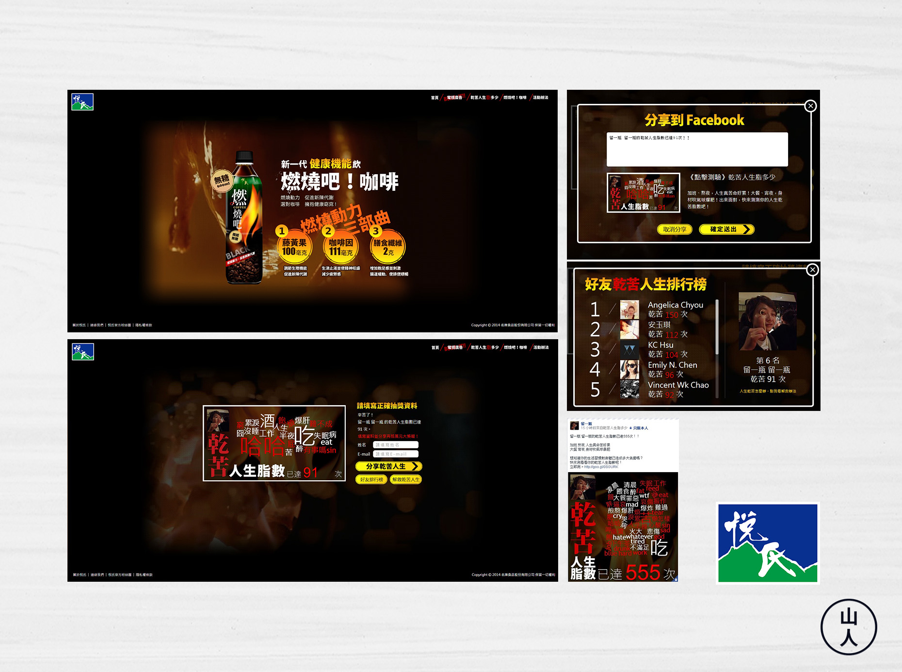 「燃燒吧!咖啡」為悅氏2014年的重點產品,產品是一款機能型黑咖啡,有添加膳食纖維和籐黃果,結合了提神和促進消化的功能,同時因為為無糖黑咖啡,不會造成身體負擔。所以我們以產品的特性做出發,找了生活型態的部落客進行產品的深度溝通,並透過網路社群遊戲「測試你的乾苦脂數」帶入產品,扣合產品概念,最後以Facebook和Google廣告雙管齊下導入活動中,創造下了超高活動參與人數。
