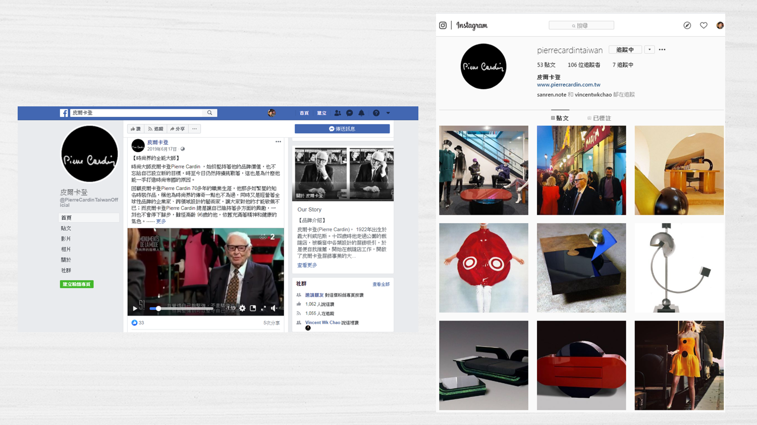我們利用皮爾卡登的品牌國外報導影片,區分各段落重製成短片,每週一則發佈在品牌的Facebook 粉絲專頁上;品牌的Instagram 方面,則是以每週四則的方式,搭配各時期的經典設計作品、重大人物照片等等的圖片素材,於三個月內密集的在社群上持續曝光。